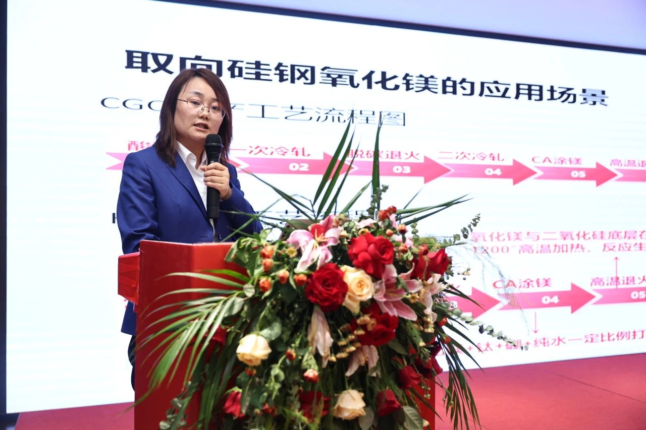 在鎂神科技研發(fā)總監(jiān)白雪梅女士的致辭中,她對(duì)鎂神科技多年來(lái)在氧化鎂領(lǐng)域的技術(shù)積累和創(chuàng)新成就做出進(jìn)一步回顧,特別是對(duì)HIB鋼專用氧化鎂項(xiàng)目做了詳細(xì)介紹。她強(qiáng)調(diào),鎂神科技在全球率先建成了雙層六列電加熱輥道窯生產(chǎn)線,通過(guò)先進(jìn)的自動(dòng)化生產(chǎn)和嚴(yán)格的質(zhì)量控制體系,確保產(chǎn)品的高純度和穩(wěn)定性。白總監(jiān)還指出,鎂神科技將繼續(xù)致力于技術(shù)創(chuàng)新和產(chǎn)品優(yōu)化,以客戶需求為導(dǎo)向,提供更優(yōu)質(zhì)的定制化解決方案,助推取向硅鋼產(chǎn)業(yè)高質(zhì)量發(fā)展!